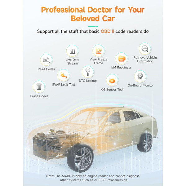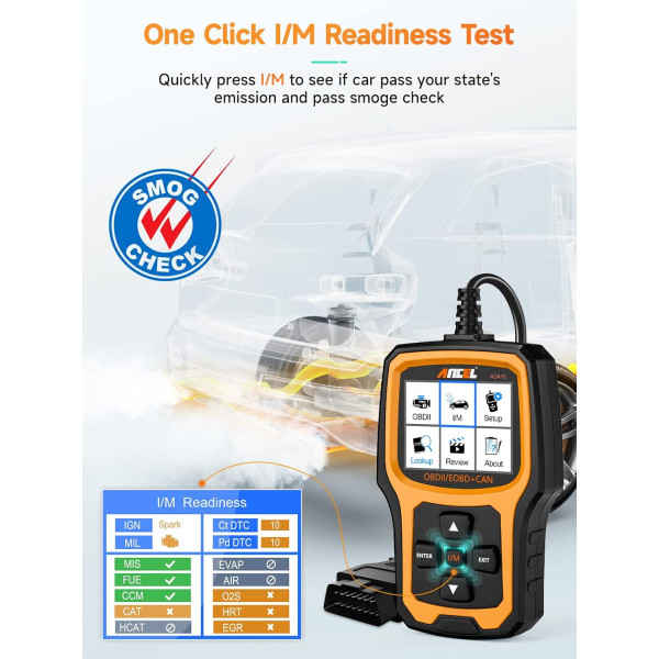 - Pantalla QVGA y nuevo UI - El lector de códigos AD410 es una gran actualización de la herramienta de escaneo de diagnóstico más básica. Tiene una pantalla LCD TFT de 2.4 pulgadas en color real (262 K) que indica los resultados de las pruebas con mayor claridad. Con el diseño de interfaz de usuario fácil de leer, puedes acceder fácilmente entre los siguientes elementos: Configuración, Diagnóstico OBDII, preparación para I/M y búsqueda y revisión de DTC. Ni siquiera necesitas leer el manual para saber qué hacer. Incluso un principiante puede utilizar fácilmente esta unidad.