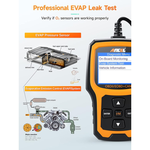 - Exclusivo OBDII DIAGNOSTICS – Soporta sensor O2 y prueba de sistema EVAP (control de evaporación). El escáner de código AD410 inicia el sistema EVAP de un vehículo de prueba de fugas monitoreando la integridad del sistema del tanque de combustible; la Prueba de Sensor de O2 es para monitorear y ajustar la mezcla aire/combustible, que puede identificar problemas relacionados con la eficiencia de combustible y las emisiones del vehículo.