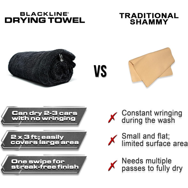 - No más manchas de agua: olvídate de revolver cuando los detalles del automóvil secen tu automóvil antes de que se seque y causen manchas de agua. La toalla de secado Blackline utiliza tecnología de microfibra Twisted-Loop para darte una manera óptima de secar tu automóvil. ¡Solo una pasada y tu coche estará 100% seco y sin rayas! Nuestros accesorios para automóvil son considerados como uno de los mejores suministros de detalles de automóviles y toallas de lavado de autos en el mercado hoy en día