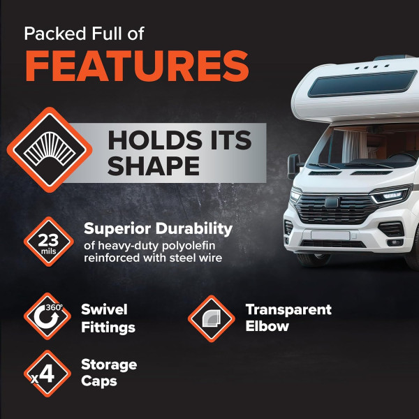 - Construcción robusta y flexible: construida con 23 mils de poliolefina duradera y reforzada con alambre de acero, la manguera de residuos RhinoFLEX RV puede doblarse y mantener su forma para un uso confiable y duradero.